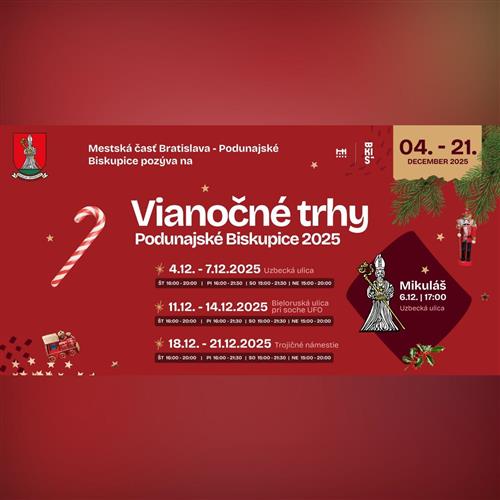 Mestská časť Bratislava-Podunajské Biskupice vás pozýva na Vianočné trhy 2025. Príjemnú sviatočnú atmosféru so sprievodným kultúrnym programom a chutným jedlom vám prinášame aj tento rok na tri miesta v našej mestskej časti.