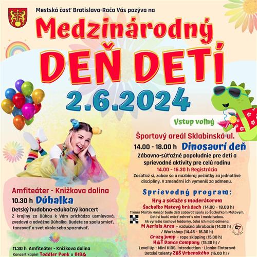 Srdečne pozývame všetky detičky a rodiny osláviť spoločne Medzinárodný deň detí s bohatým sprievodným programom a to v nedeľu 2. 6. 2024 hneď na dvoch miestach v MČ Bratislava-Rača: