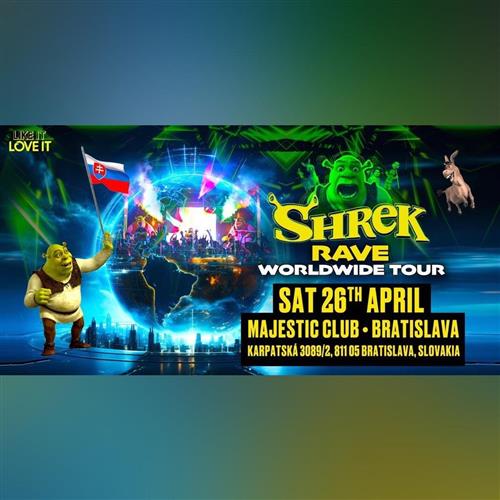 SHREK RAVE IS COMING TO BRATISLAVA! You’re invited to our swamp for SHREK RAVE! DJs playing Shrek hits & party bangers all night long to bring out your inner ogre! Shrek DJ Set, Crazy Shrek Performers, ‘I’m A Believer’ Singalongs, Shrek Visuals, Shrek Giveaways & Shrek Themed Drinks Venue: Majestic Music Club, Karpatská 3089/2, 811 05 Bratislava, Slovakia Times: Day Rave 8pm - 2am Last Entry: 9pm (Get In Early To Catch All Performances & Games!) Date: Saturday 26th April 15+ Dress code: GREEN or Your Favourite Shrek Character - Best Shrek inspired outfit wins a prize! * This event is a Shrek Inspired Rave and we do not own the copyright. * Please contact our Comms Team: reservations@shrekraveofficial.com with any questions you have (please include; The Event Name / Date / Location & if you are an existing customer your Full Name / Order Number). We aim to respond to all enquires within 48 hours (excluding weekends & public holidays).