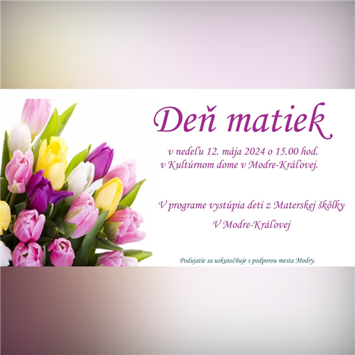 Občianske združenie OZ Kráľovan srdečne pozýva spoločne osláviť Deň matiek v nedeľu 12. mája 2024 o 15.00 hod v Kultúrnom dome v Modre - Kráľovej.