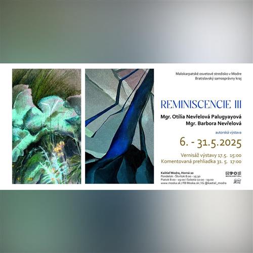 Výstava Mgr. Otílie Nevřelovej Palugyayovej a Mgr. Barbory Nevřelovej pod názvom Reminiscencie III v Kaštieli v Modre je pre verejnosť prístupná od 6. do 31. mája 2025, počas návštevných hodín od pondelka do štvrtka v čase od 8:00 do 15:30, v piatok od 8:00 do 19:00 a počas sobôt od 10:00 do 19:00. V sobotu 17. mája o 15:00 Vás pozývame na vernisáž výstavy a stretnutie s autorkami spojené s kultúrnym programom. Osobne Vás výstavou autorky prevedú aj v sobotu 31. mája v čase od 17:00 do 19:00.